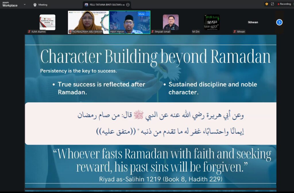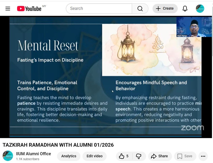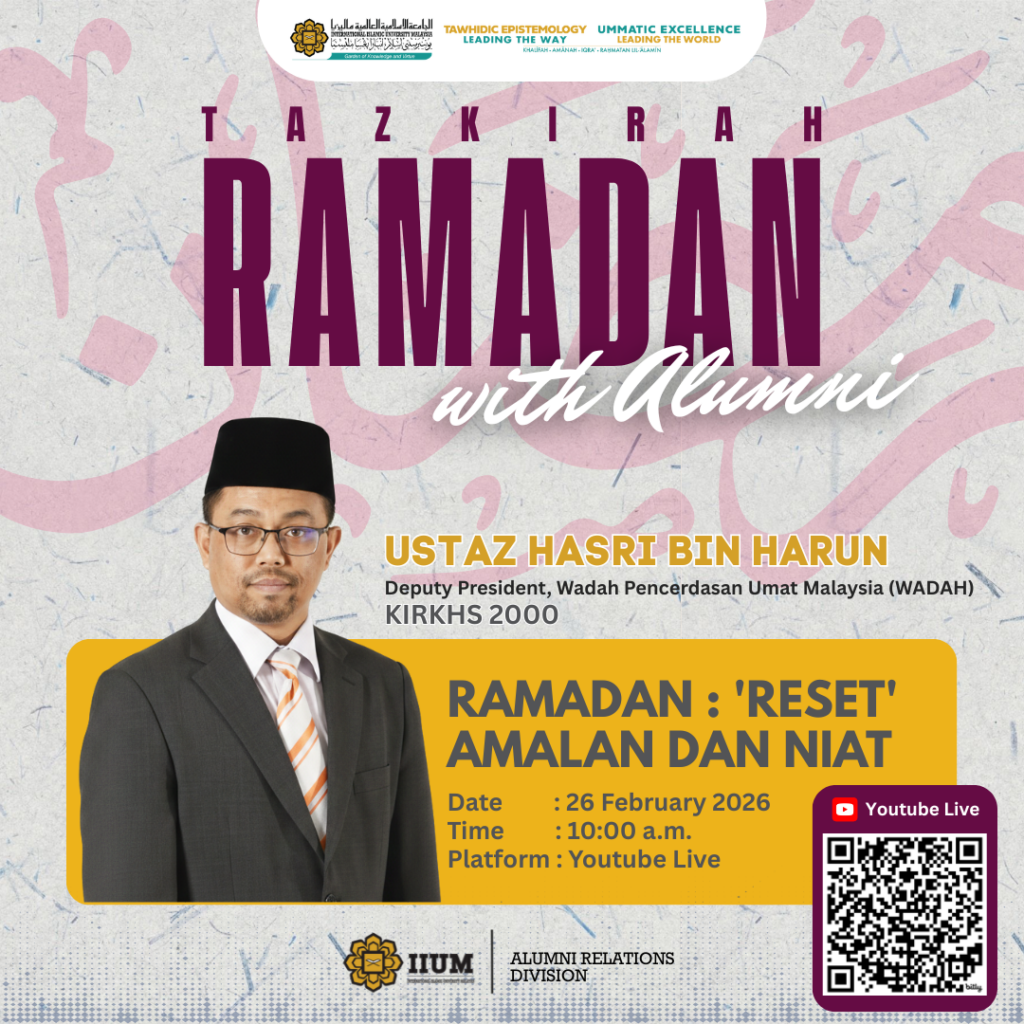 Events/Programmes Tazkirah Ramadan with IIUM Alumni No.1/2026 26 February 2026 - "Ramadan: 'Reset' Amalan dan Niat" by Ustaz Hasri Bin Harun (KIRKHS 2000), Deputy President WADAH #IIUMAlumni #OurAlumniOurPride #TazkirahRamadan #IIUM Click here