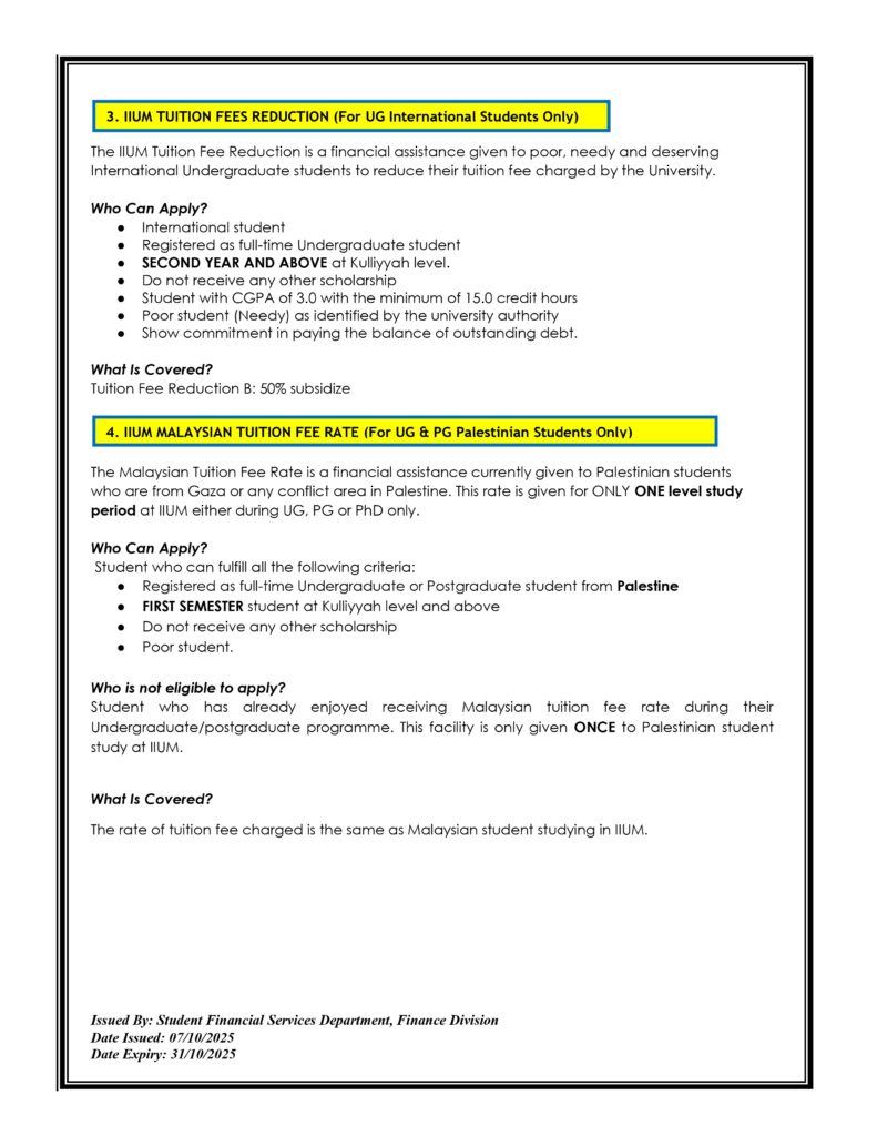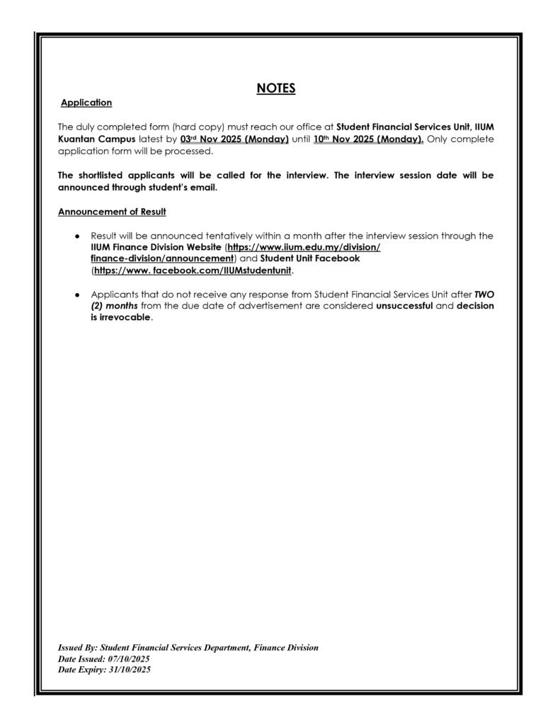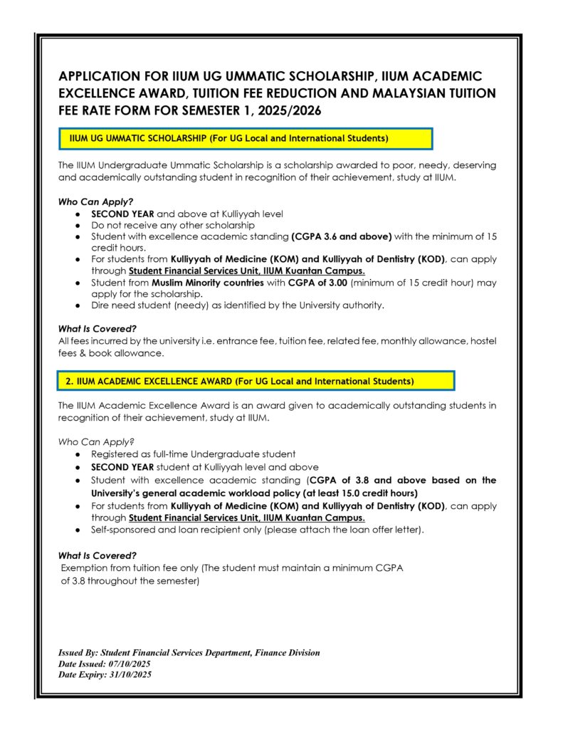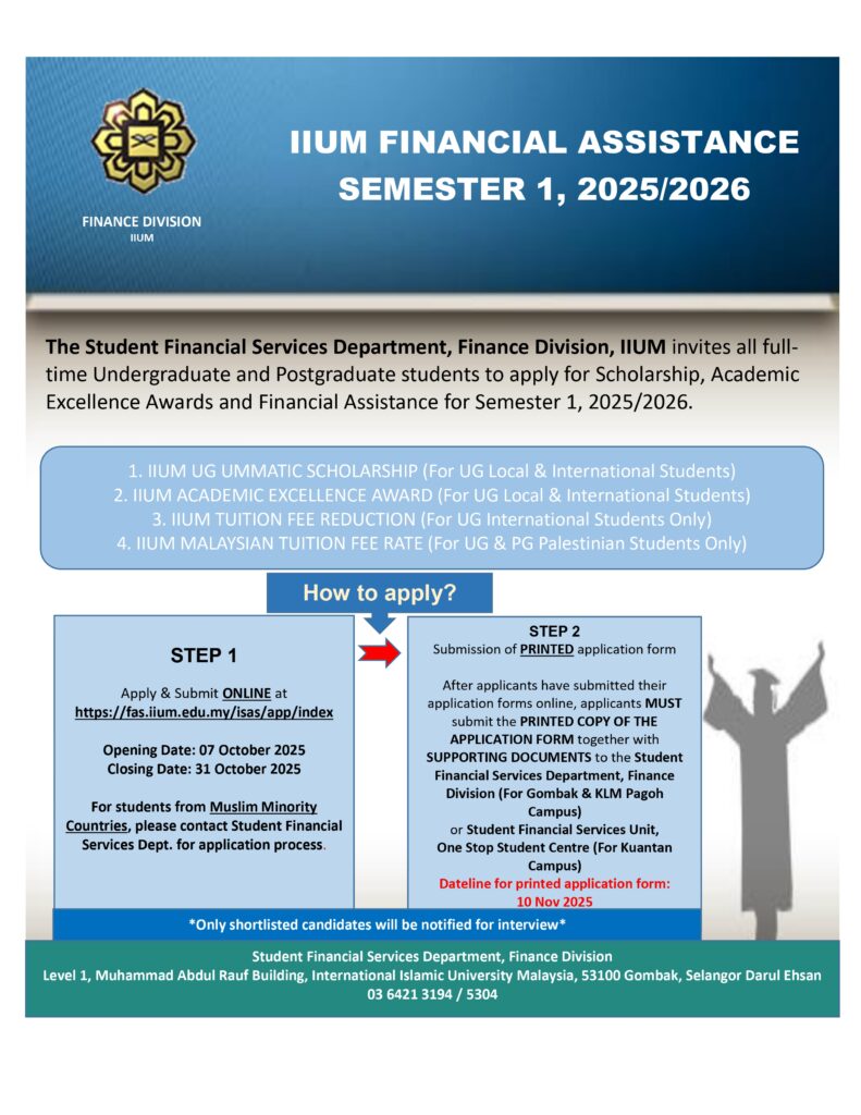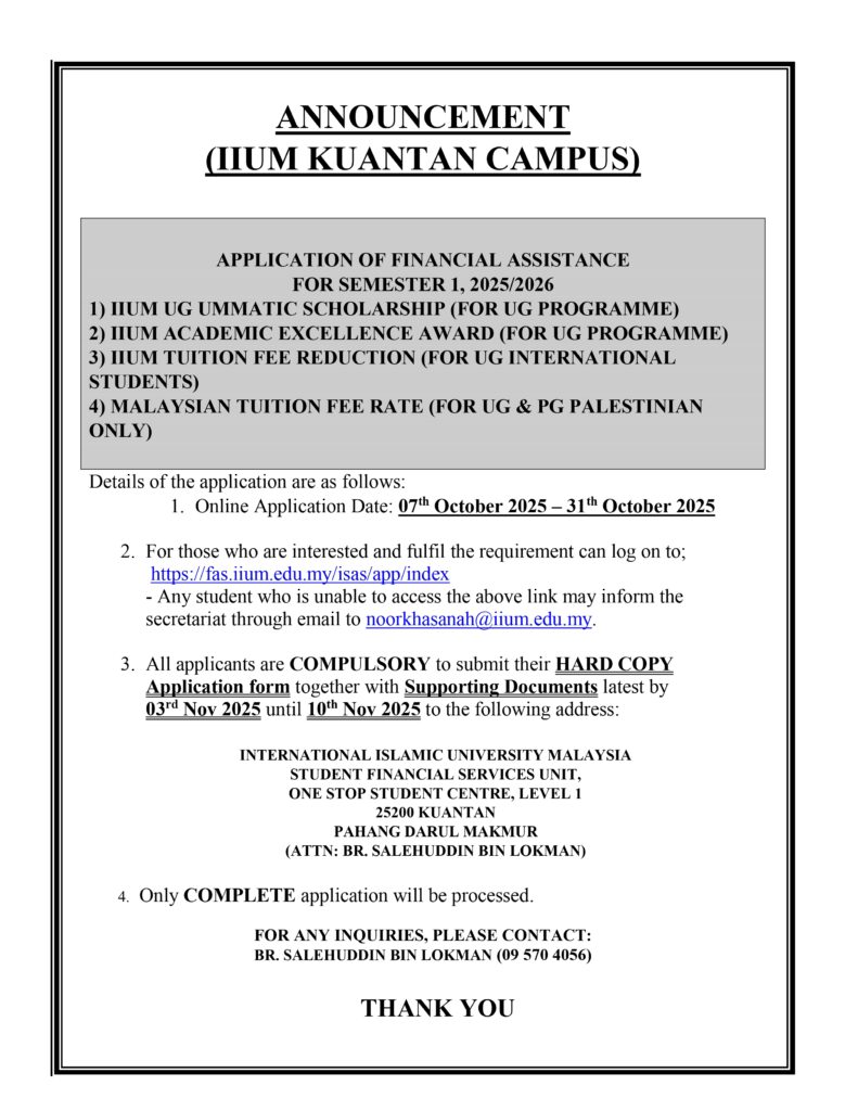 ANNOUNCEMENT OF APPLICATION FOR FINANCIAL ASSISTANTSHIP AND IIUM UG UMMATIC SCHOLARSHIP FOR SEMESTER 1,2025/2026 (KUANTAN CAMPUS)