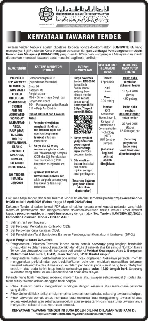 PROPOSED REFURBISHMENT OF FIRE ALARM SYSTEM AT SEVEN (7) MAHALLAH FOR THE INTERNATIONAL ISLAMIC UNIVERSITY MALAYSIA, GOMBAK, SELANGOR DARUL EHSANTender No.: IIUM/DEV/3(4)/2026