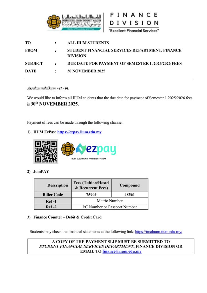 DUE DATE FOR PAYMENT OF SEMESTER 1, 2025/2026 FEES