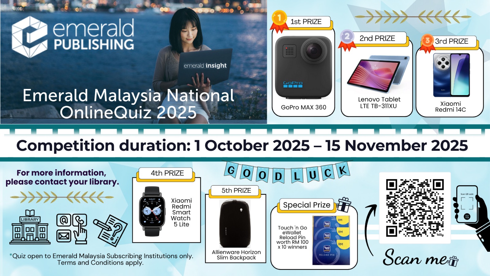 Emerald PUBLISHING – Emerald Malaysia National OnlineQuiz 2025. 1st PRIZE GoPro MAX 360, 2nd PRIZE Lenovo Tablet LTE TB-311XU, 3rd PRIZE Xiaomi Redmi 14C and many more. Click HERE for more details.