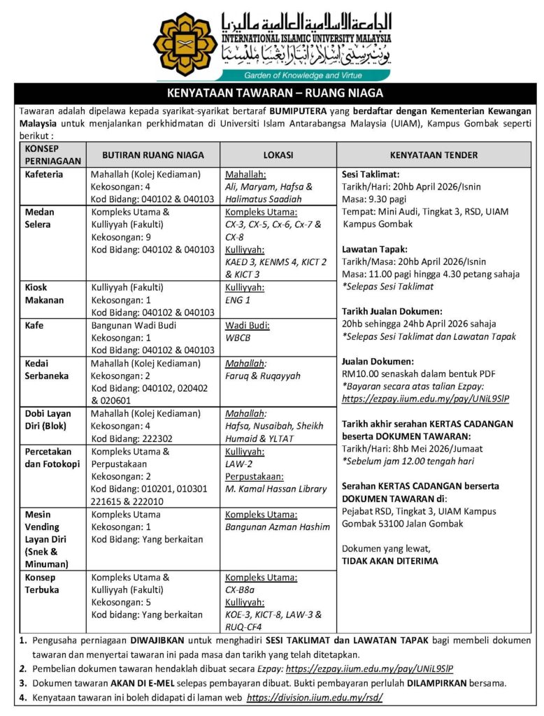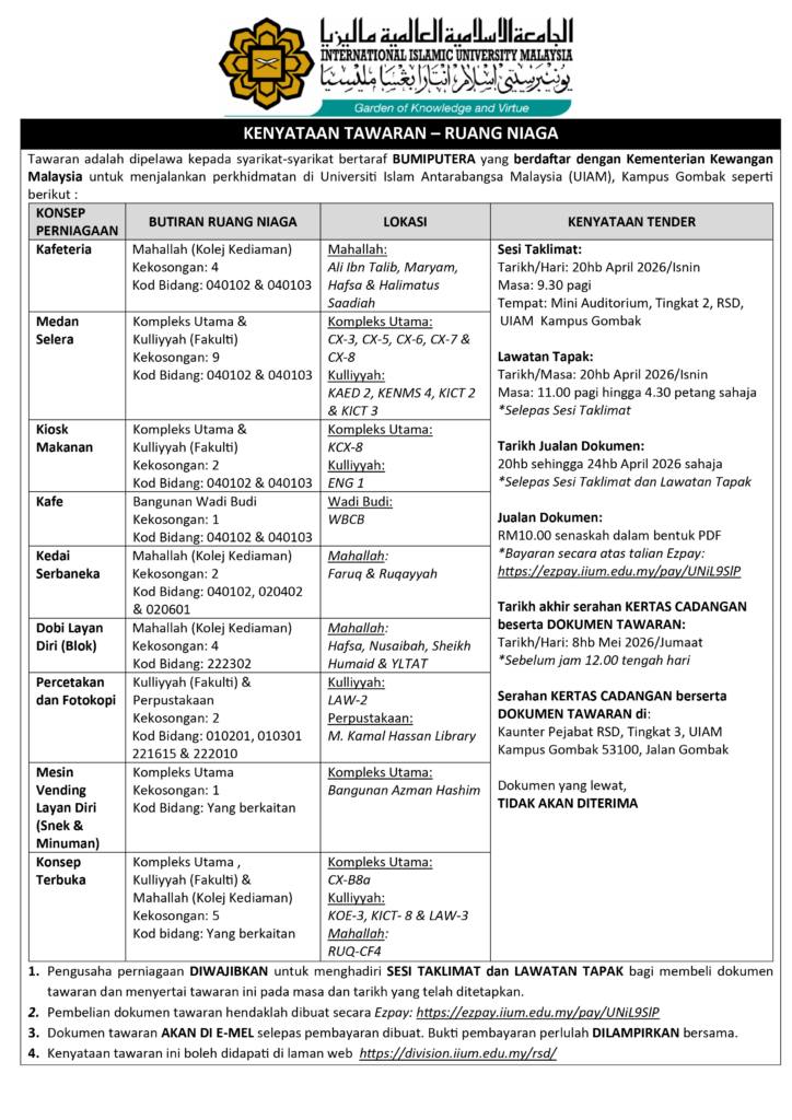 OUR SERVICES STUDENT RESIDENTIAL (MAHALLAH) FOOD COURT / CAFETERIA AUDITORIUM / HALL OFF-CAMPUS APARTMENT IIUM HOMESTAY AUXILIARY SERVICES RSD ACTIVITIES BUSINESS SPACE RENTAL 2026 Click here to download the advertisement