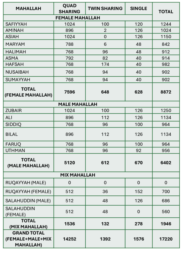 - Room types vary by Mahallah and may include quad sharing room, twin Sharing room, and single room. For upgraded room, we have single executive room, premium twin sharing room and studio room.