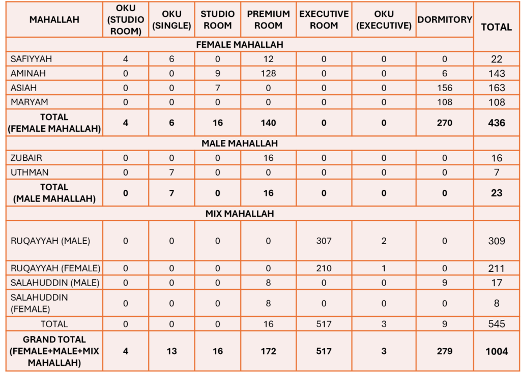 - Mahallah accommodation is primarily provided to Undergraduate and Postgraduate students, subject to IIUM policies and room availability.