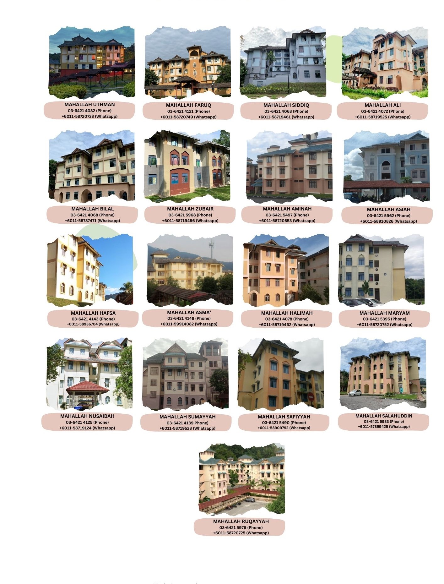 Students’s residential college of the International Islamic University Malaysia (IIUM) is known as Mahallah. The word Mahallah refers to a place where it is supposed to be a self-contained not only with services but also activities. IIUM chooses to name its Mahallah after the leading companions of the Prophet S.A.W and the female Mujahidah and Syuhada. There are 17 Mahallah in Gombak Campus that accommodate about 17,000 students.