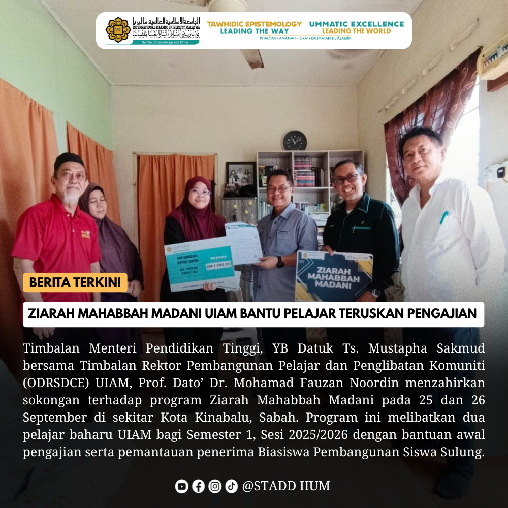 Sejajar dengan komitmen ini, YB Timbalan Menteri Pendidikan Tinggi Datuk Ts. Mustapha Sakmud diiringi oleh Prof. Dato’ Dr. Mohamad Fauzan Bin Noordin, Timbalan Rektor Pembangunan Pelajar dan Penglibatan Komuniti (ODRSDCE) UIAM, turut menzahirkan sokongan bagi program Ziarah Mahabbah Madani pada 25 dan 26 September di sekitar Kota Kinabalu, Sabah.