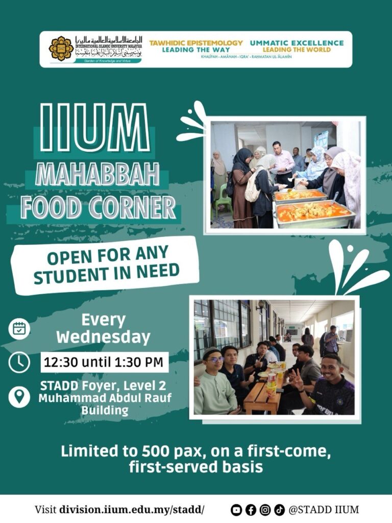 Please be informed that Student Affairs and Development Division will organise the following programme where IIUM student whoever in need may come to our food corner. Limited to 500 pax only while stock last.