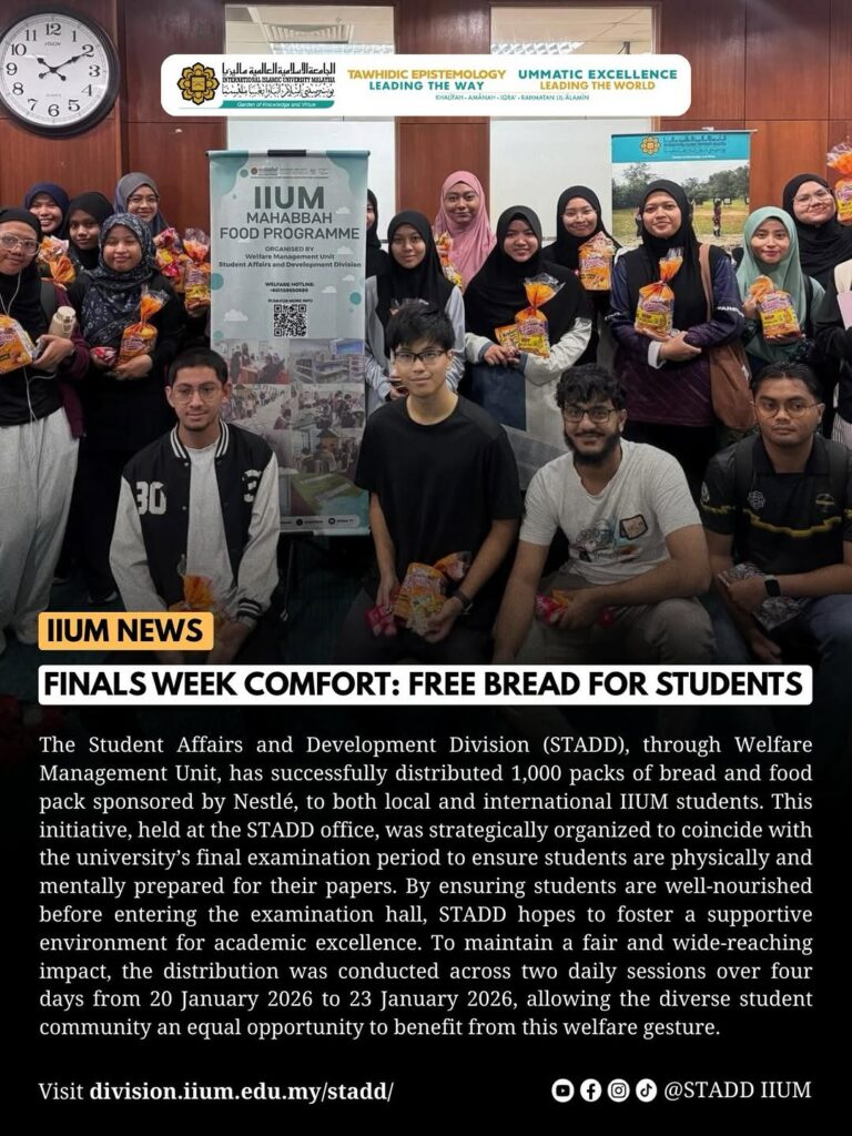 Assalamualaikum Wrt. Wbt. The Student Affairs and Development Division (STADD) successfully distributed 1,000 bread and Nestlé-sponsored food packs to local and international IIUM students from 20 to 23 January 2026. Held at the STADD office during the final examination period, this initiative was strategically designed to boost students’ physical and mental readiness for their papers. To ensure equitable access across the diverse student community, the distribution was organized into two daily sessions over the four-day duration. Deputy Rector Prof. Dato’ Dr. Mohamad Fauzan Bin Noordin stated that this programme aligns with the university’s commitment to holistic student wellbeing. He further invited government agencies, the private sector, NGOs, and individuals to contribute through monetary or in-kind sponsorships to ensure the initiative’s continued success and support for student excellence. WELFARE MANAGEMENT UNITSTUDENT AFFAIRS AND DEVELOPMENT DIVISION