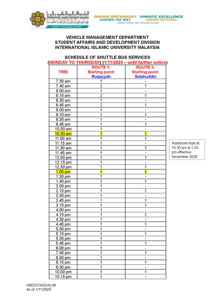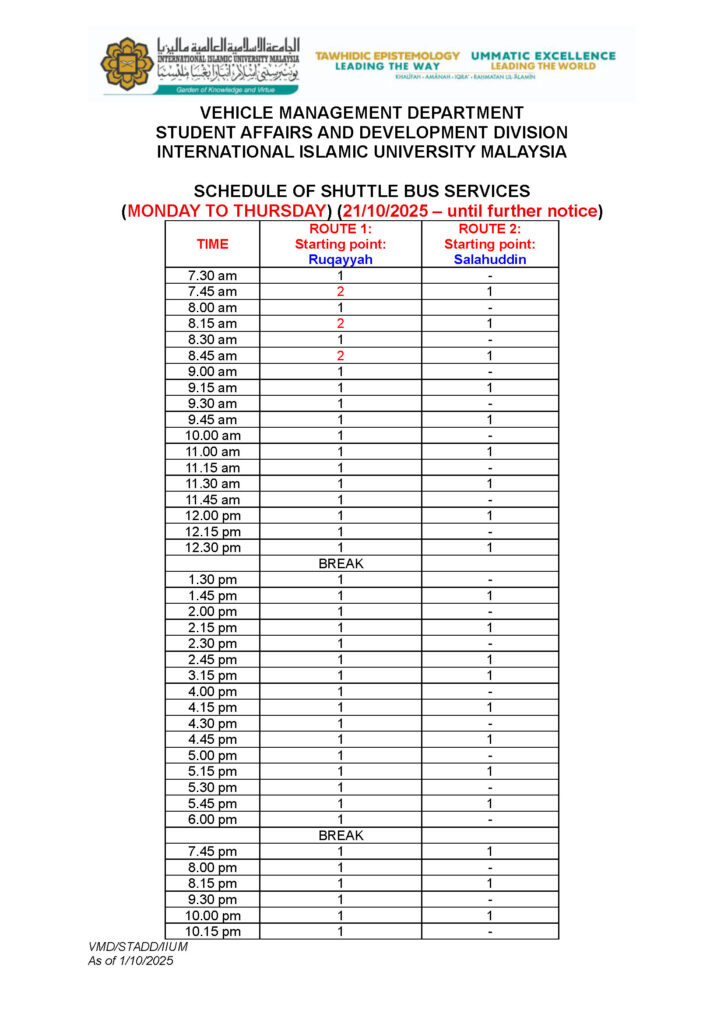 Schedule for the Shuttle Bus (Monday to Thursday) 21-Oct-2025 until further notice