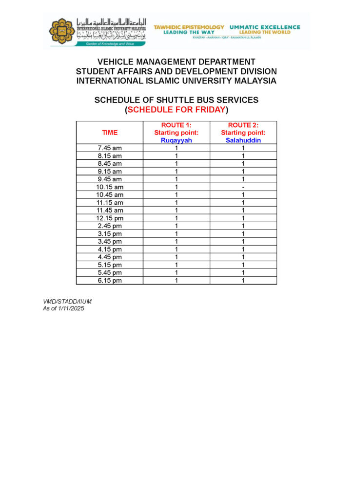VMD provides a regular shuttle bus service, ensuring safe and timely transport across the IIUM campus and making daily commuting hassle-free for the university community.
