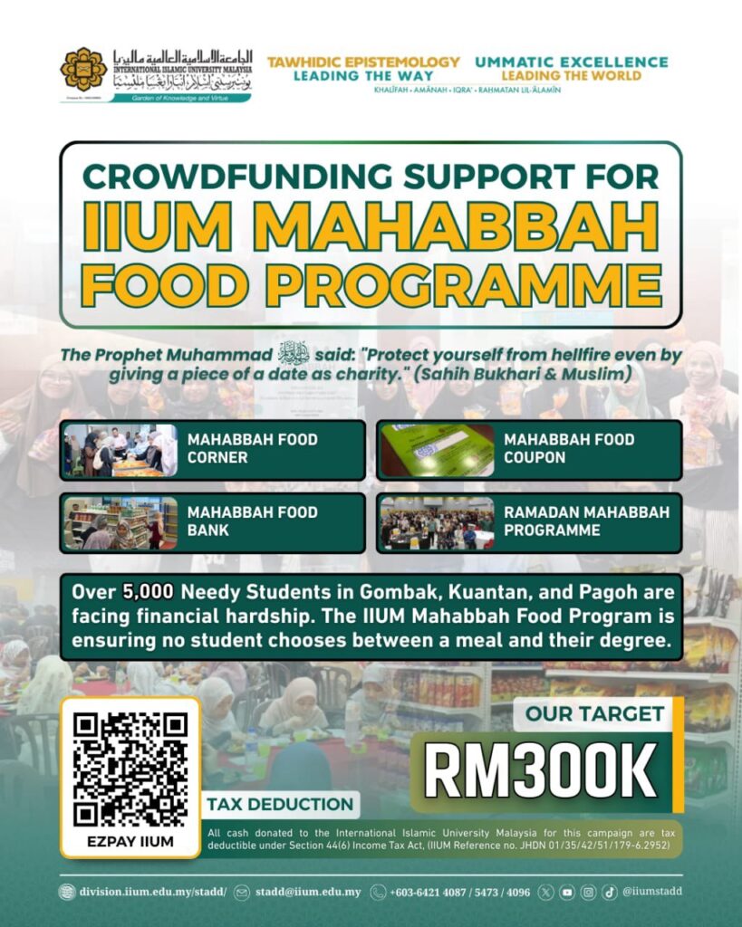 This programme offers initiatives such as IIUM Mahabbah Food Coupon, IIUM Mahabbah Food Bank, IIUM Mahabbah Food Corner and IIUM Ramadan Mahabbah Programme.